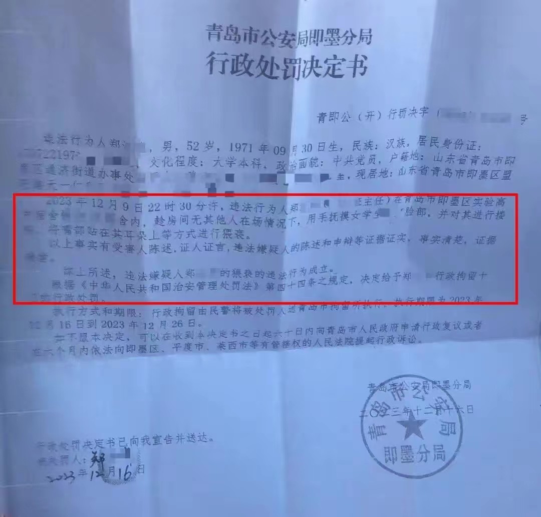 昨天,青岛市公安局即墨分局的行政处罚决定书出来了,上面写了,郑某猥亵女学生,事实清楚、证据确凿,决定给予郑某行政拘留十日的处罚决定。