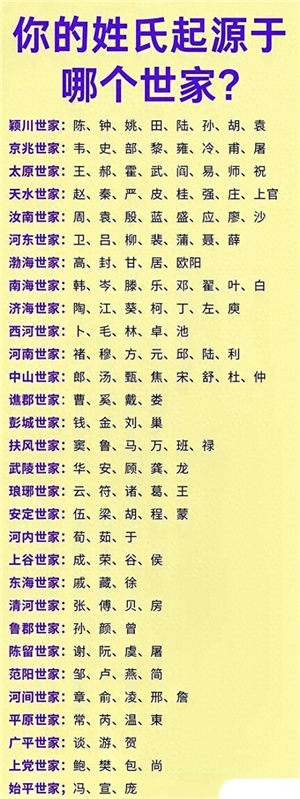 “赵”姓,自天水世家而来。“高”姓,源自渤海世家。“贺”姓,承袭广平世家的光荣传统。在这姓氏世家一览表中,我们发现一个引人深思的现象:一个世家竟能包容三至八个不同的姓氏,这些姓氏皆来自同一传承。追溯至500年前,我们不仅见证相同姓氏之家族关系,更发现同一世家的姓氏共同构筑了一个大家庭,宛如图中所展现。