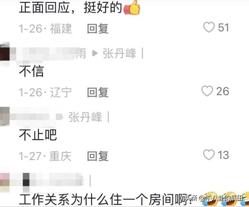 有网友称赞张丹峰正面回应是好事,但也有网友表示不相信张丹峰和毕滢的关系单纯,还质问张丹峰如果是工作关系,为什么两人要住套房,而且是什么工作非得要毕滢。