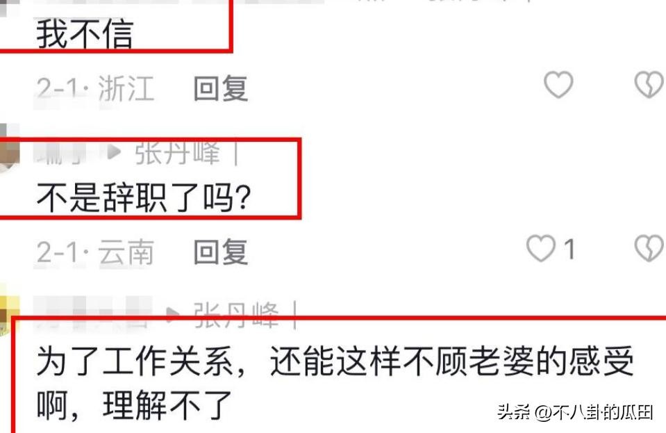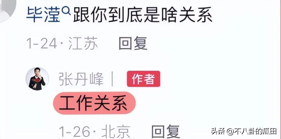 而近日,有网友发现张丹峰在自己发布的动态下面回应网友的评论,终于正面回应了他和毕滢的关系。评论区的网友问他和毕滢到底是什么关系,张丹峰用4个字直接回应:工作关系。