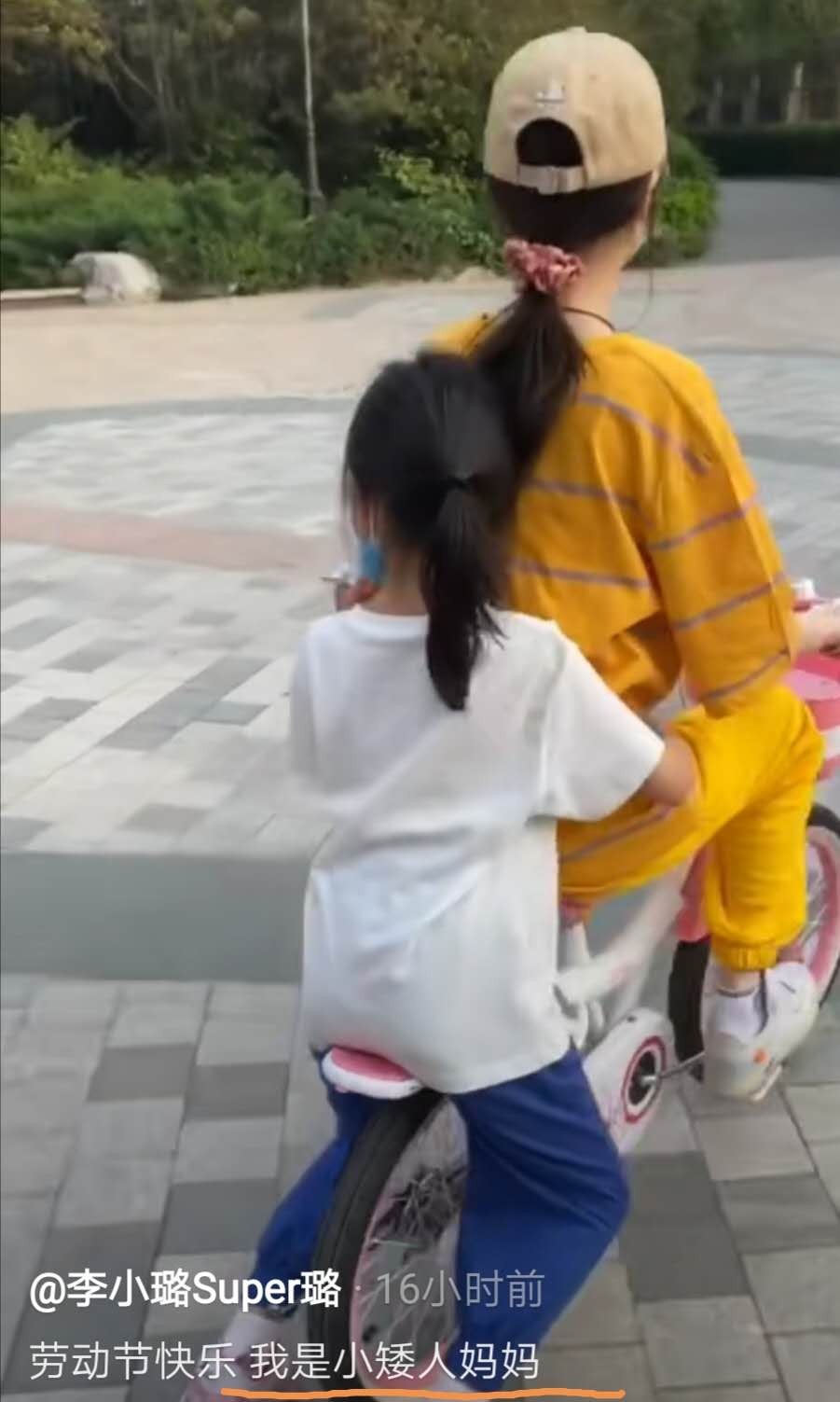 视频中,她身穿黄色运动套装,脚踩小白鞋,戴着帽子和口罩包裹严实,骑着甜馨的粉色儿童车玩得不亦乐乎。
