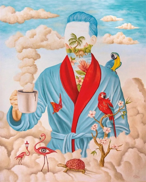 在艺术家Rafael Silveira笔下,人的面部被置换成了一个异想世界。用色虽然柔和,但是如心脏鸟和独眼花等元素不禁让人毛骨悚然。