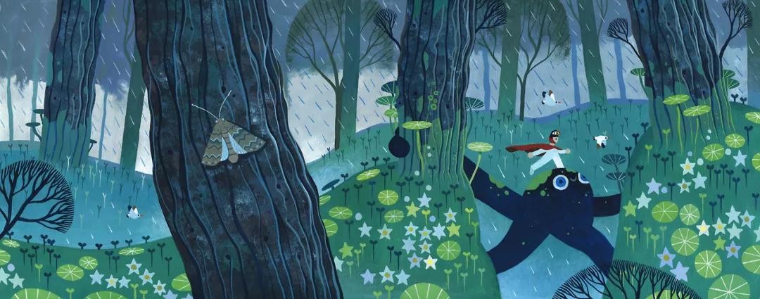 梦幻的森林与奇异的植物花卉营造了一种神秘感和童话感,人物奔跑的动作为原本静态的画面增添了许多活力。