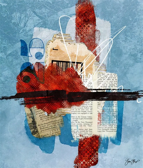 还可以创造抽象风的拼贴作品,比如插画师Gina Startup采用了报纸拼贴、丙烯和photoshop等综合媒介。
