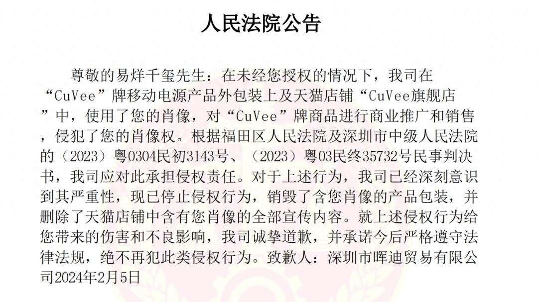致歉声明内容显示,深圳市晖迪贸易有限公司在“CuVee”牌移动电源产品外包装上及天猫店铺中使用了易烊千玺的肖像,对品牌商品进行商业推广和销售,侵犯了易烊千玺的肖像权。经法院判决,该公司承担侵权责任。