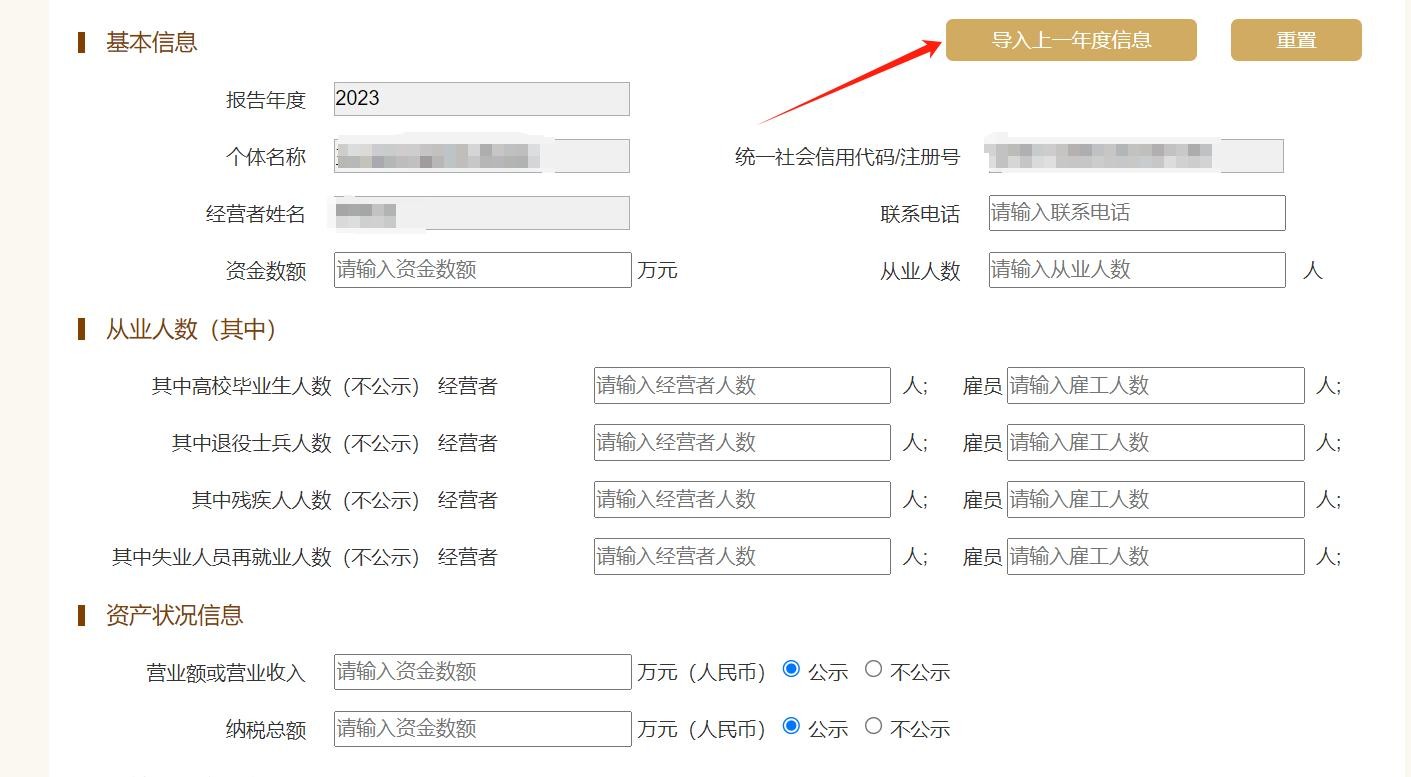 6、如实填写相关内容,或者可以选择“导入上一年度信息”