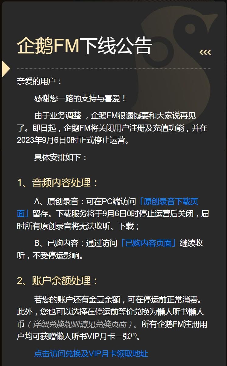 企鹅 FM 发布下线公告。