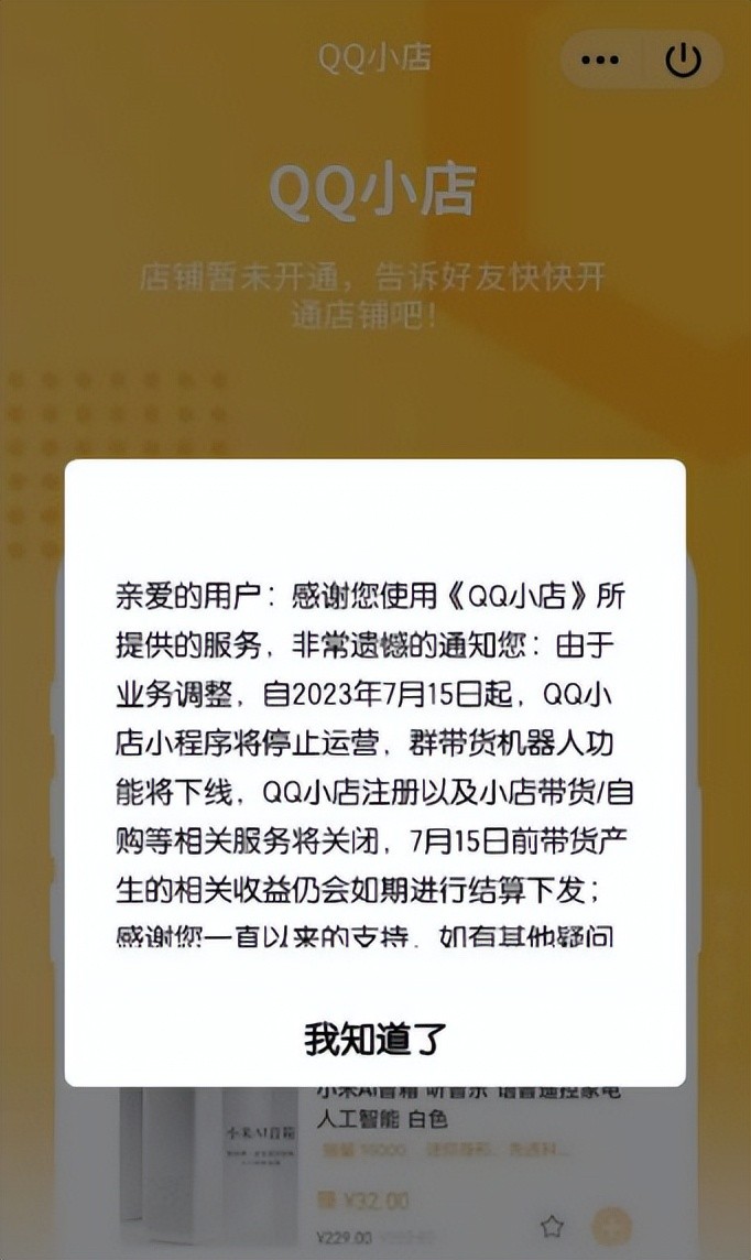 QQ小店小程序 将停止运营。