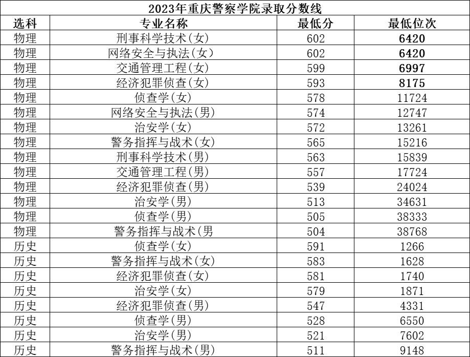 重庆警察学院2023年物理类各专业录取分数线:刑事科学技术(女)602分、网络安全与执法(女)602分、交通管理工程(女)599分、经济犯罪侦查(女)593分、侦查学(女) 578分、网络安全与执法(男)574分、治安学(女) 572分、警务指挥与战术(女)565分、刑事科学技术(男)563分、交通管理工程(男)557分、经济犯罪侦查(男)539分、治安学(男)513分、侦查学(男) 505分、警务指挥与战术(男)504分,最低分位次38768.