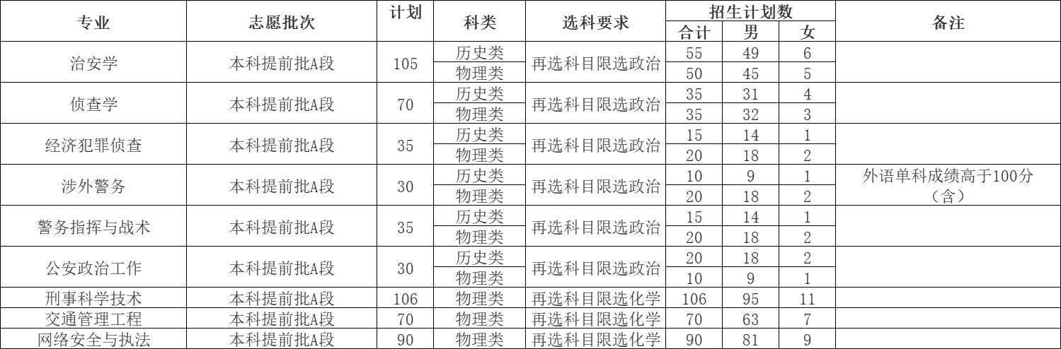 治安学、侦查学、经济犯罪侦查、涉外警务、警务指挥与战术、公安政治工作6个专业再选科目限选政治。刑事科学技术、交通管理工程、网络安全与执法三个专业再选科目限选化学。