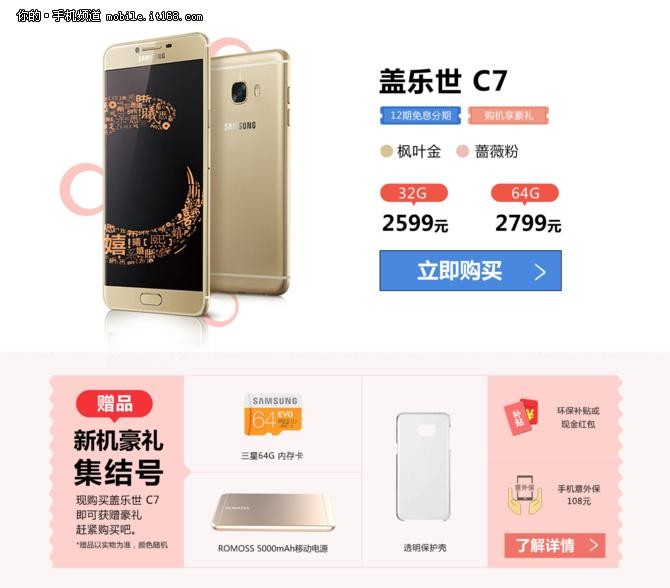 三星Galaxy C7已全面开启首销活动,在三星手机天猫旗舰店、京东、苏宁易购等电商平台同步开卖。三星Galaxy C7机身存储32GB版本的官方售价2599元,64GB版则是更超值的2799元,拥有枫叶金、蔷薇粉、皎洁银、烟雨灰四色亮彩机身可选。在三星官网还可以相守12期免费分期,现在下单赠送三星 64GB存储卡、5000mAh移动电源、透明保护壳的三星官方大礼包。