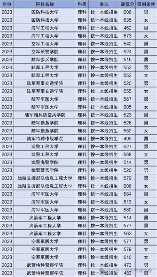 从贵州省的录取数据来看,2023年在贵州理科提前批招生的军校一共有19所,分数线最高和最低的分别是国防科技大学(635分、女)和海军工程大学(462分、男)。