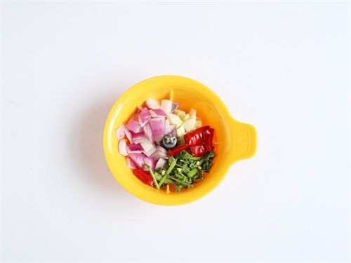 1.碗中放入洋葱+辣椒+香菜+大蒜打碎