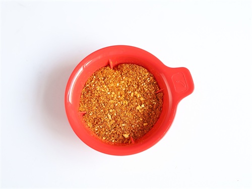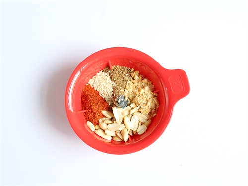 3.准备熟芝麻15克、熟花生45克、辣椒粉20克、孜然粉10克、花椒粉5克、味精5克、盐3克、白糖20克、桃酥1小块打碎