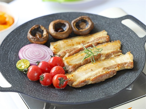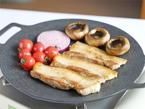 2.先放五花肉,烤出油后再煎其他的