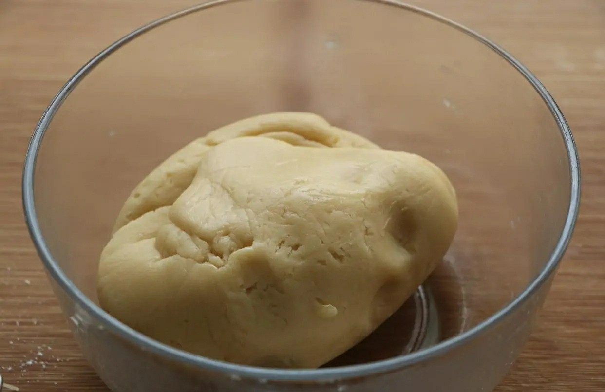 5.中筋面粉280克、猪油90克、白糖18克、清水约135克,揉成光滑的面团,然后盖上保鲜膜,让面团醒30分钟。