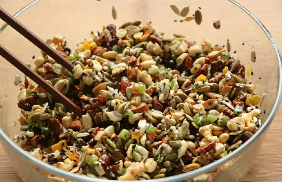3.把所有的果仁处理好之后,全部装在一个的盆里,搅拌均匀,备用;