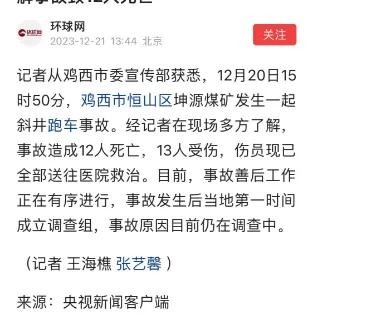 12月20日,黑龙江省鸡西市恒山区坤源煤矿发生一起斜井跑车事故,造成12人死亡,13人受伤。这是继11月29日山西省晋城市泽州县一煤矿发生瓦斯爆炸事故后,不到一个月内发生的第二起重大煤矿事故。这两起事故,再次引发了社会对煤矿安全问题的关注和担忧。