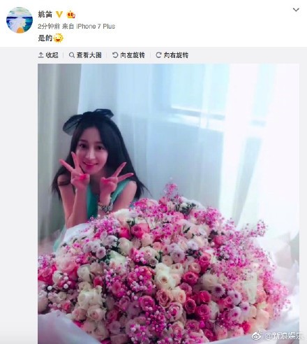 然而,就在观众以为这又是一场绯闻的时候。昨天晚上,姚笛在微博发文“是的”,并配上自己与大捧鲜花的照片,疑似承认了恋情。