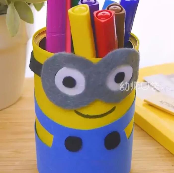 准备好黄色、蓝色的海棉纸,照着小黄人的样子裁裁剪剪,然后粘在笔筒就做好啦!即将步入小学的孩子们,笔筒可是孩子们的必需品。