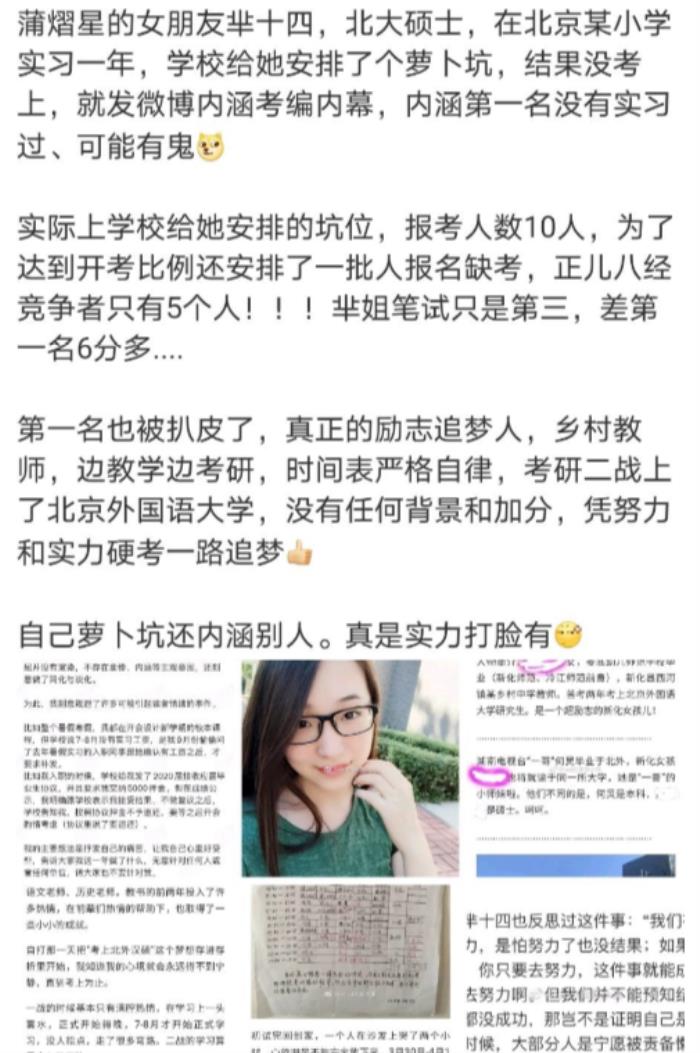 现在这个蒲熠星的女朋友考编失败,本来是不值得上热搜的,但确实因为内涵得了第一名的人上了热搜。