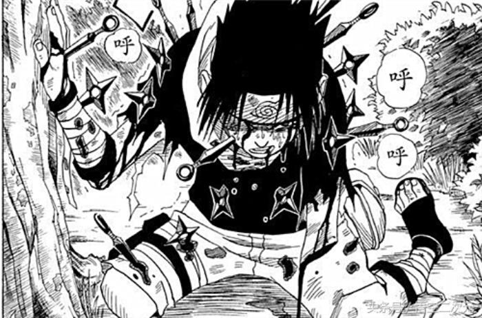 在漫画中卡卡西对小樱施展幻术,幻境中佐助的左臂被砍断场面一度血腥(难道在这里岸本就已经暗示佐助以后会断臂了吗?),而在动画中佐助的只是全身插满手里剑,手臂却还是完好的,漫画的场景并没有被还原出来。