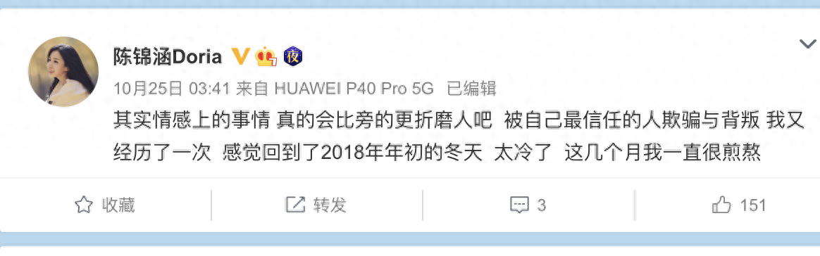 从陈锦涵的话里,我们不难看出她对于这段不能公开的地下恋情的心酸。“尽管我很需要你,也不敢跟其他人说我男朋友是武大靖,怕影响到你!最后这一切仿佛都是一厢情愿,原来你仅有的个人时间也不属于我一个人。”