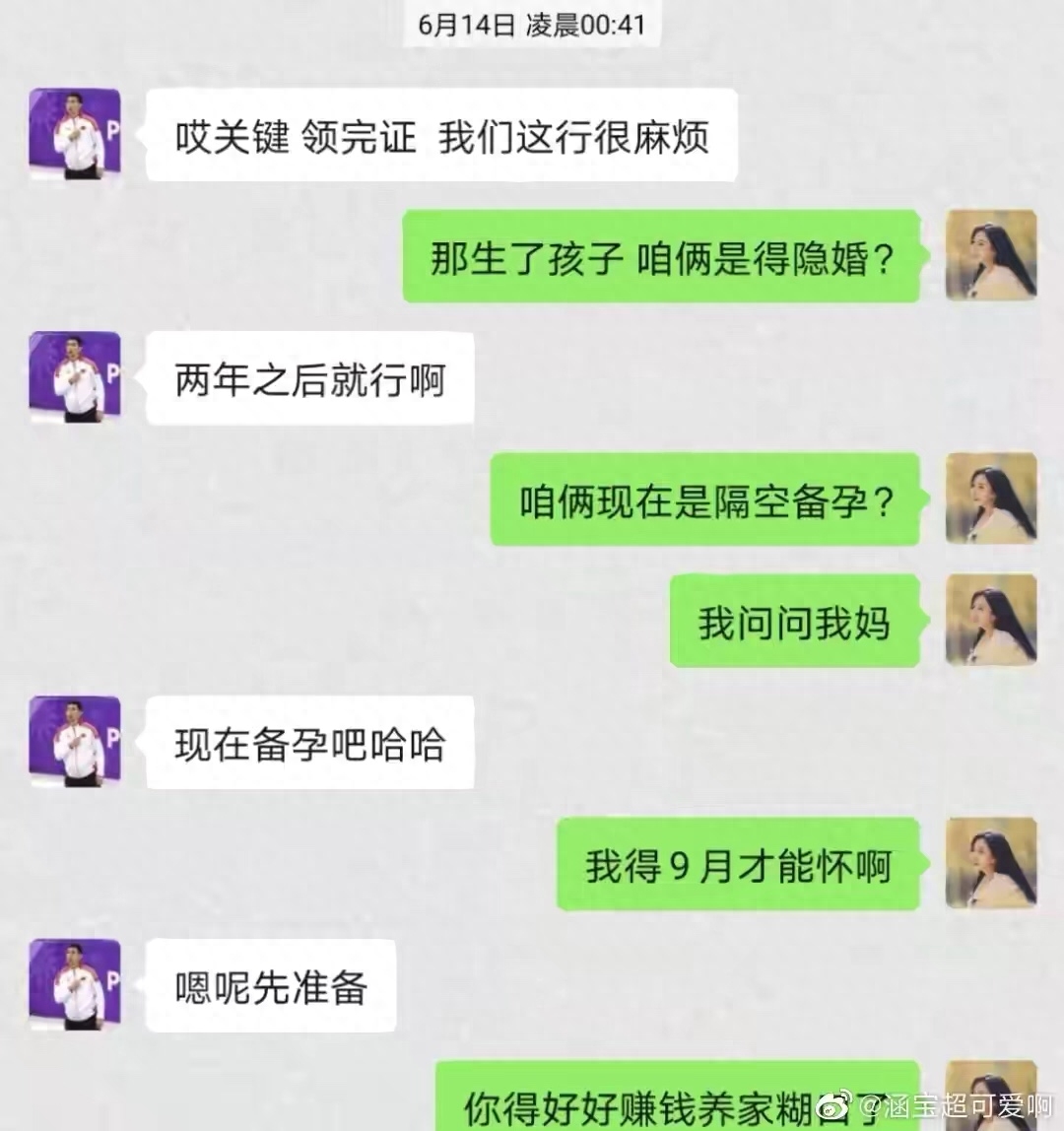 陈锦涵曝出的聊天记录显示,她与武大靖之间曾经有过美好的过往,但是在结婚与生孩子这件事上,显然与武大靖之间有着不小的分歧。作为现役运动员,武大靖表示:“队里不让生”,但是在这之上,他又表示,生了孩子之后两年之后再领证。那么既然生孩子可以公开,那么为什么结婚不行呢?