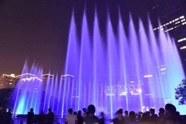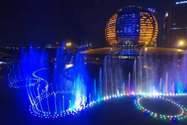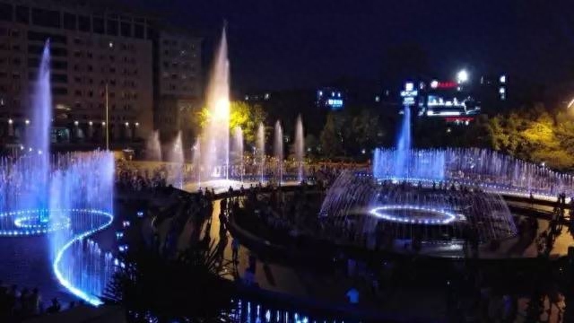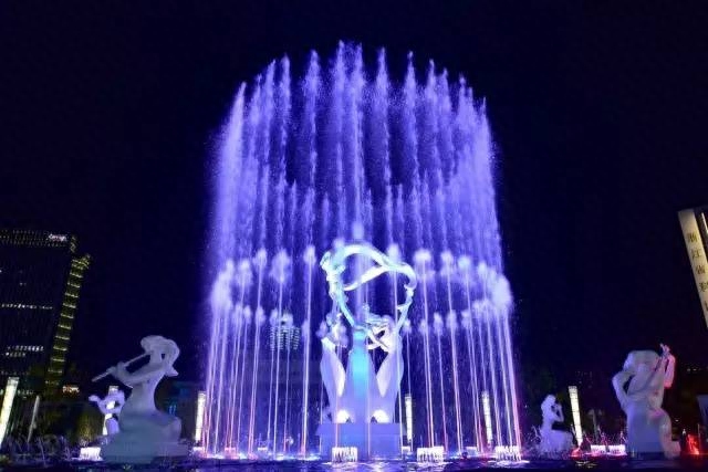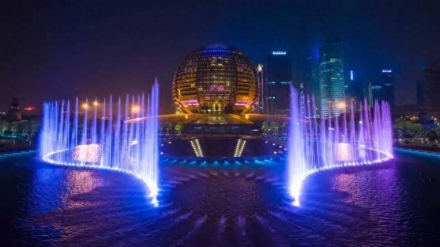 来杭州最高建筑之一的寰球中心楼下看喷泉吧。喷泉的水型变化多样,波光跳泉、一注冲天,莲花内拱、火树银花,水柱最高可达20多米。