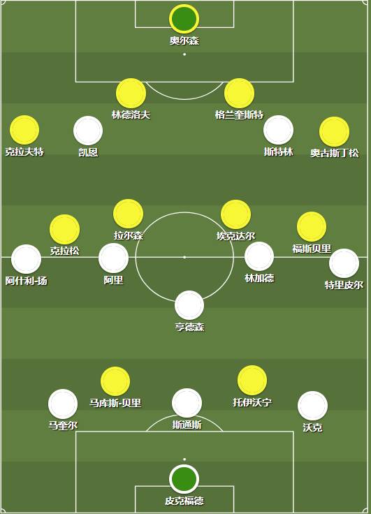中场:特里皮尔、阿里、亨德森、林加德、阿什利-扬