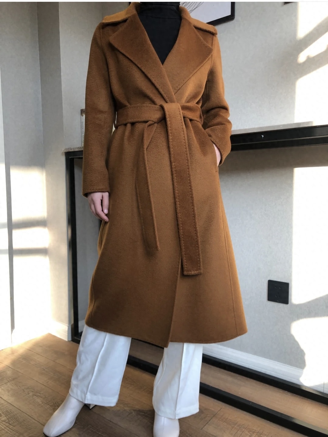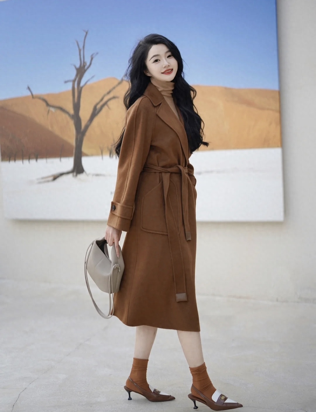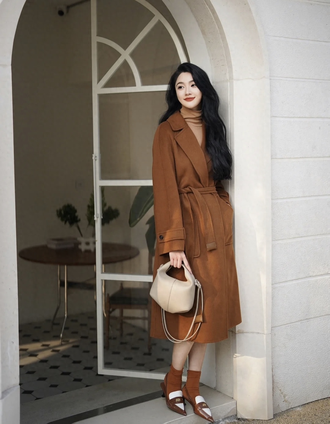 look2 焦糖色大衣+内搭同色高领/白色九分裤/高跟鞋