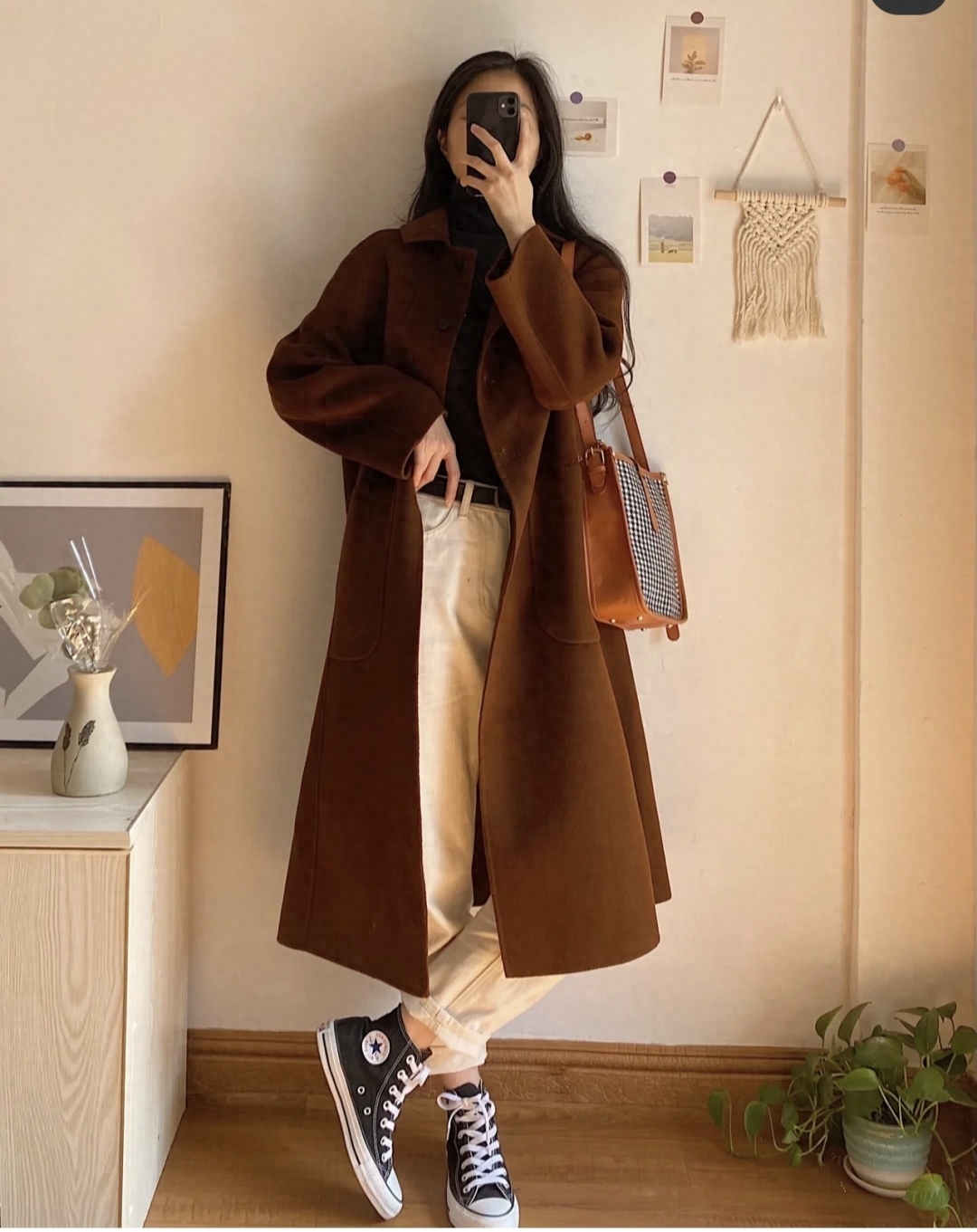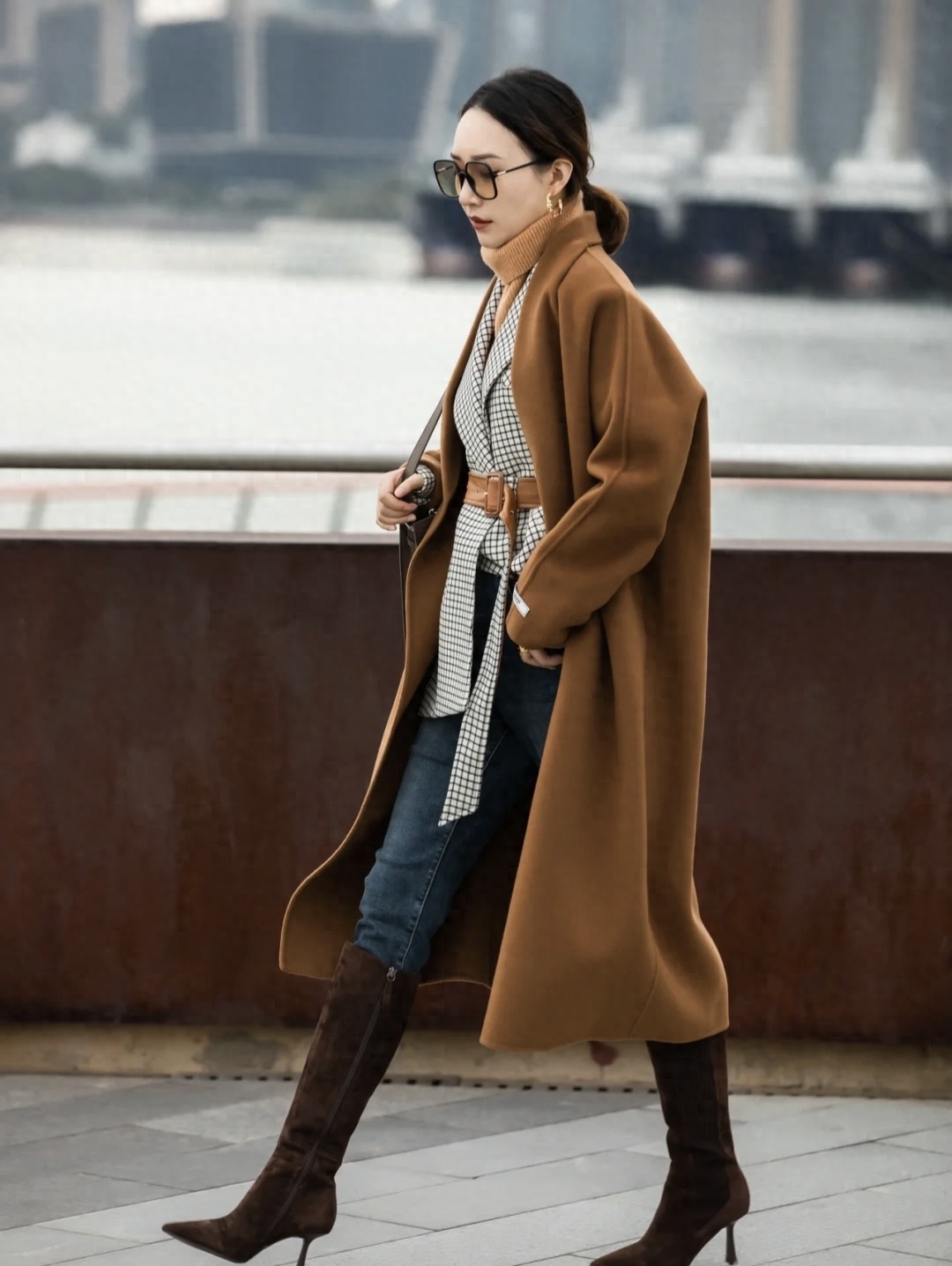 look6 焦糖色大衣+格子衬衫/高领打底/小直筒仔裤/长靴