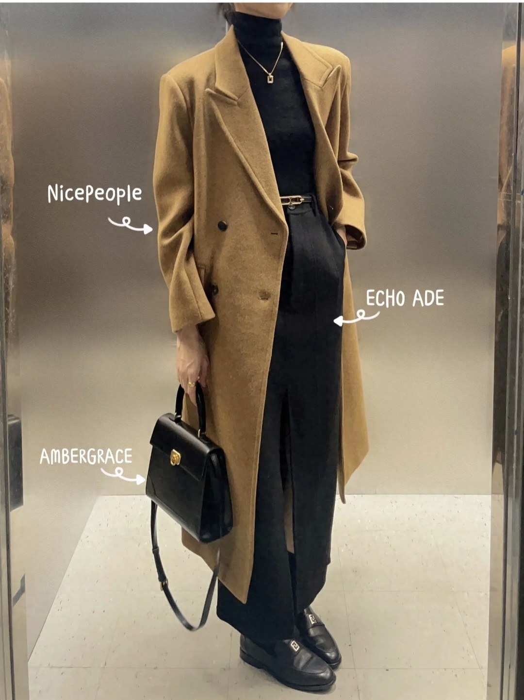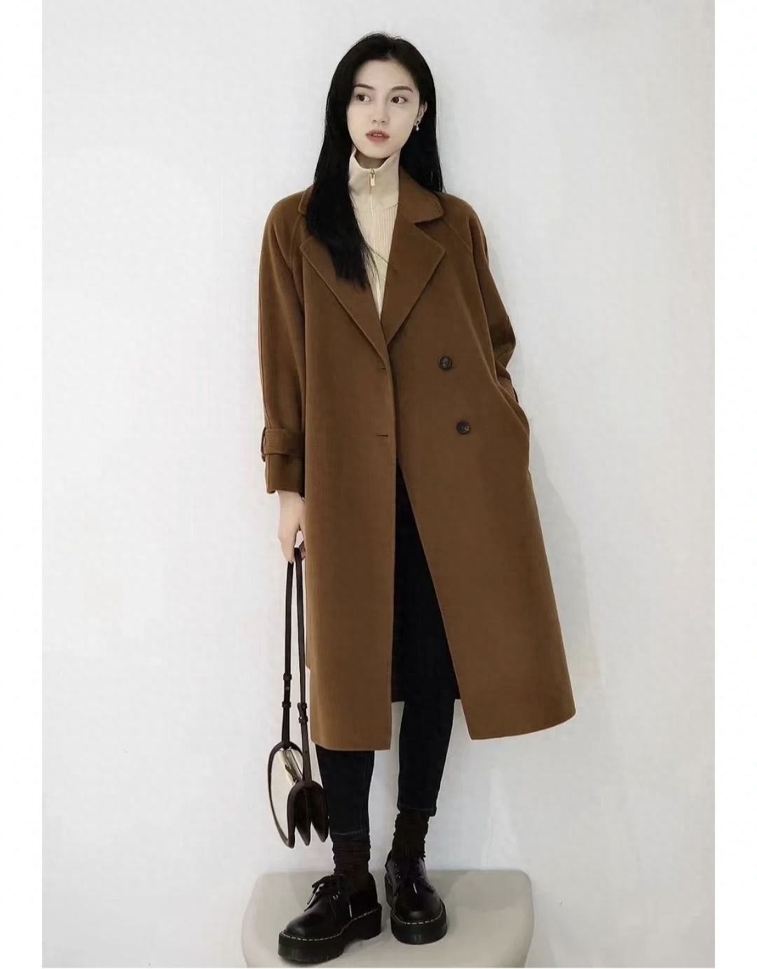look4 焦糖色大衣+同色系高领打底/高跟鞋