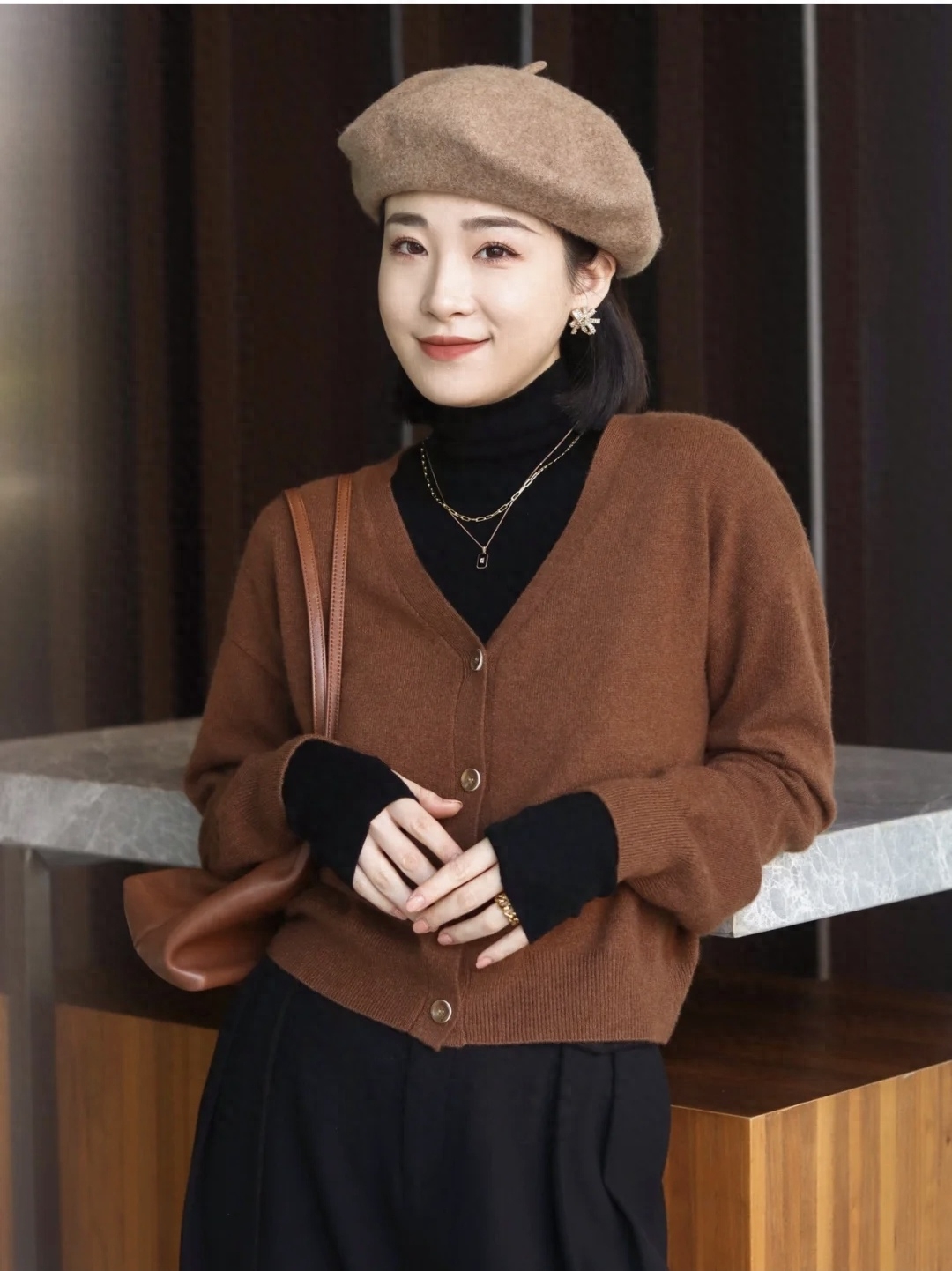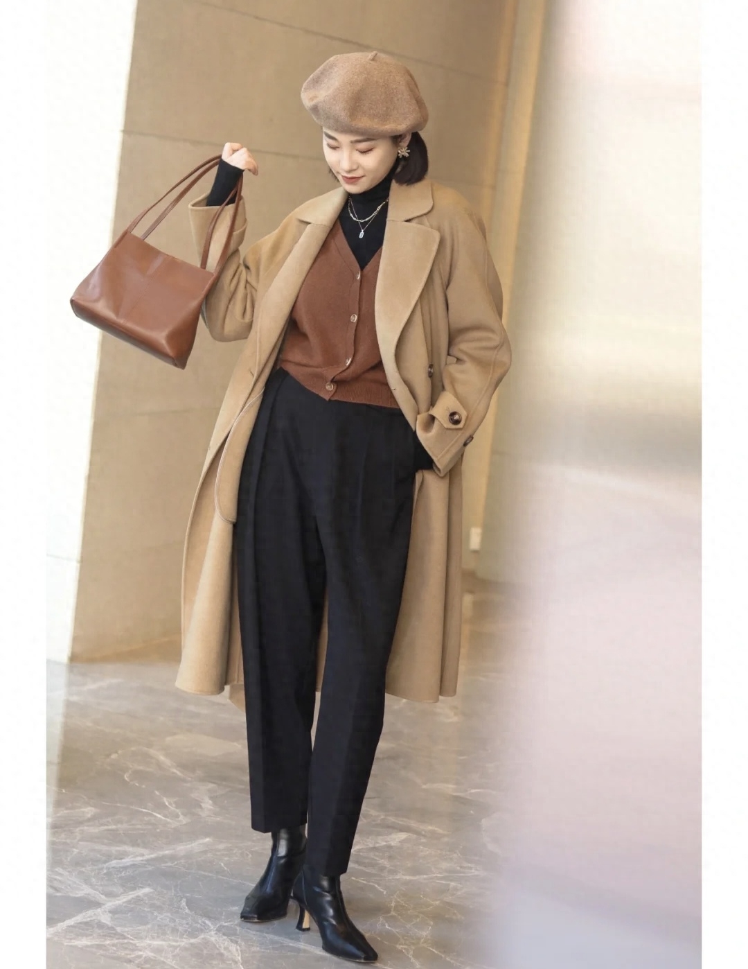 look8 焦糖色大衣+同色系针织开衫/黑色烟管裤/高跟靴