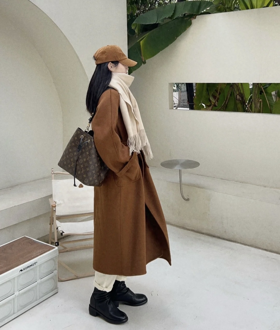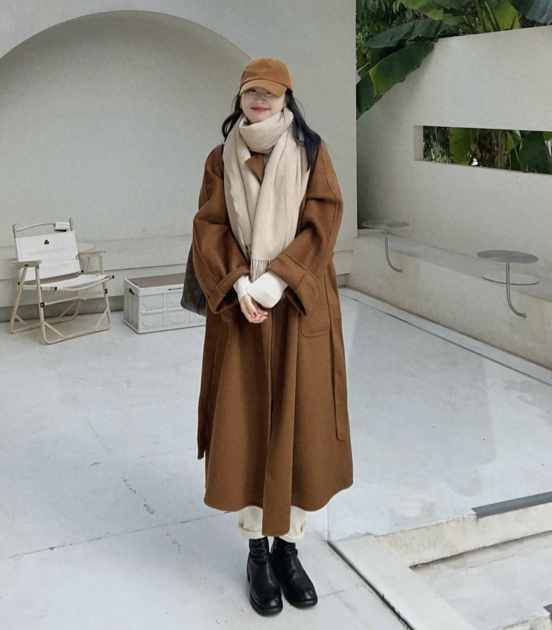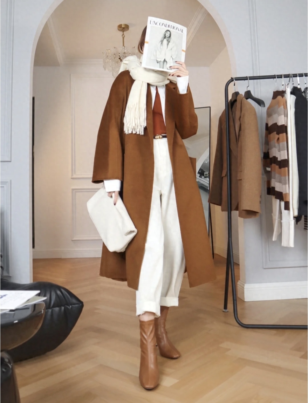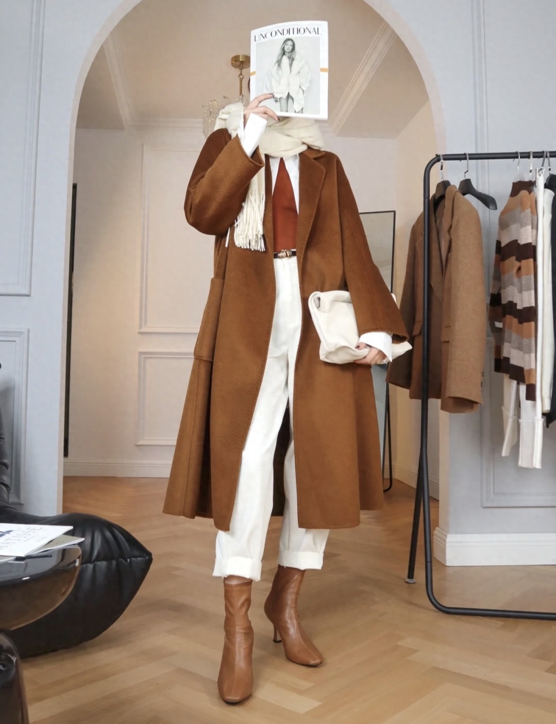 这件焦糖色大衣很nice,内搭白色针织毛衣打底,下半身选择了九分直筒白色牛仔裤和黑色短靴,围上围巾增加保暖,和大衣同色系的帽子增加休闲感~