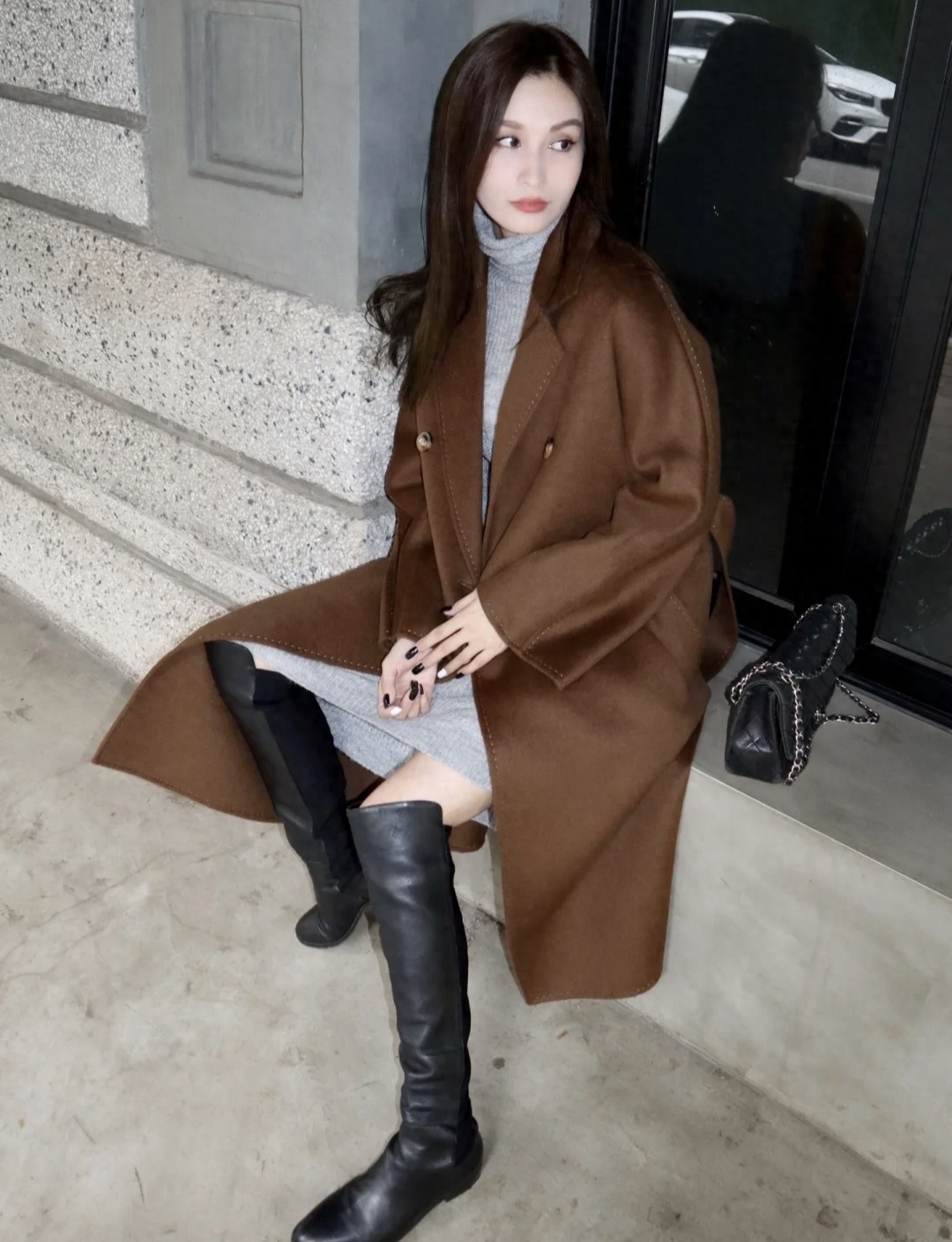 look1 焦糖色大衣+灰色高领针织裙/黑色长靴