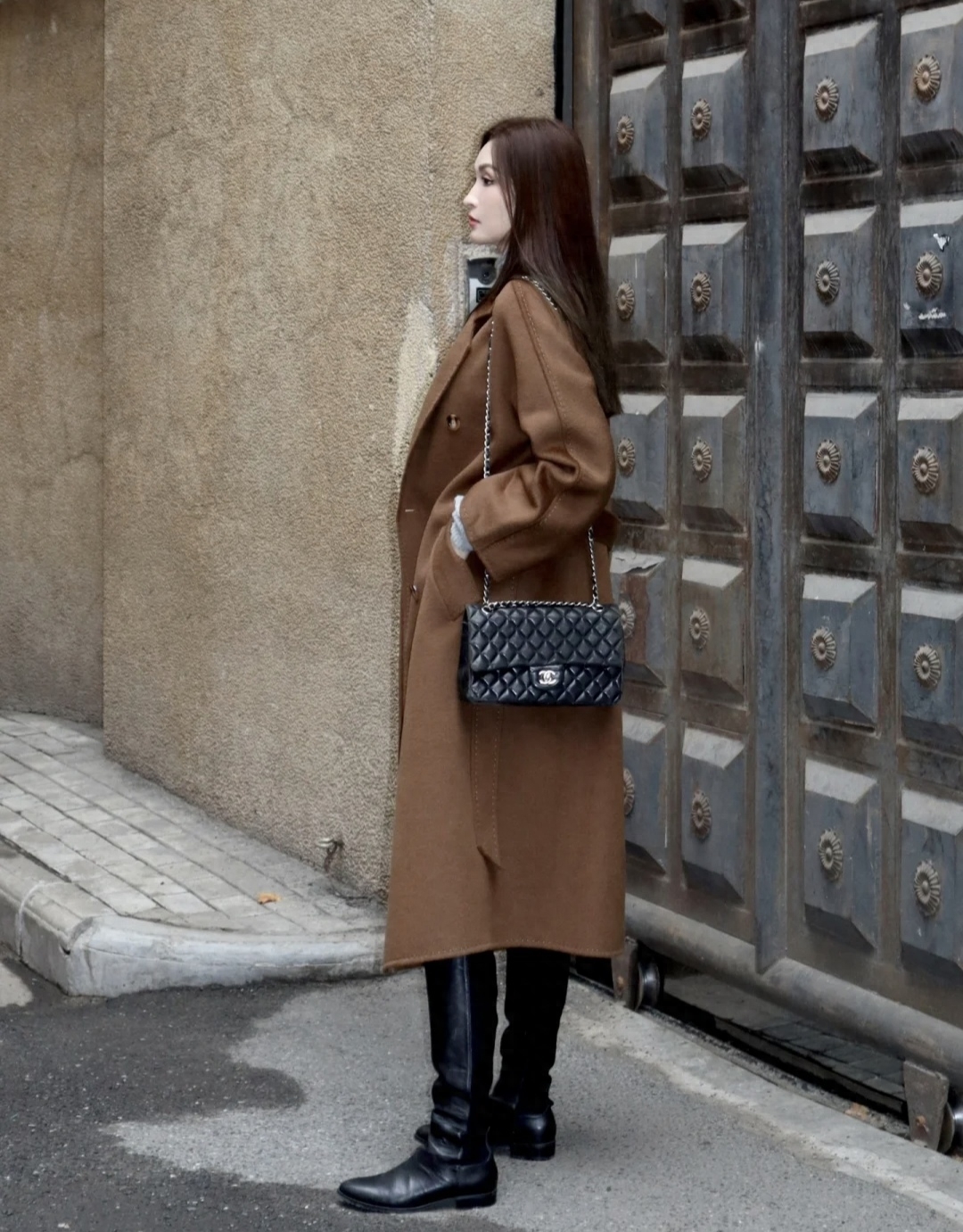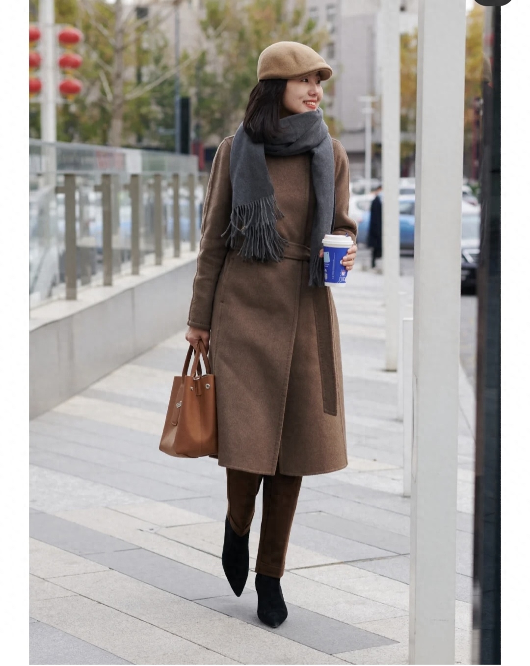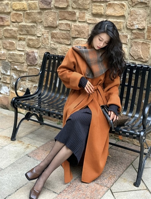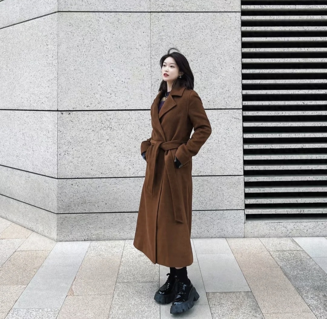 焦糖色是个非常有氛围感的颜色,有故事感适合秋冬。降温入冬,一件羊绒大衣直接变身韩剧女主角。内搭灰色针织裙和黑色长靴,立马变得高雅有气质,出街时尚又吸睛~