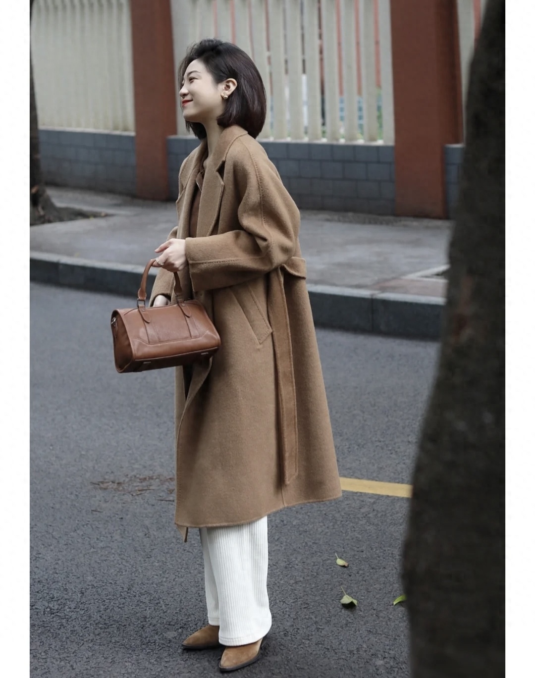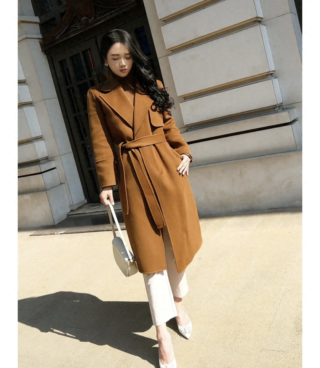 焦糖色大衣真的看起来太高级了,搭配同色系的内搭+白色九分裤+白色高跟鞋,立马优雅大气,适合各位都市丽人,绑上腰带更加利落大方,敞开穿也是松弛感满满~