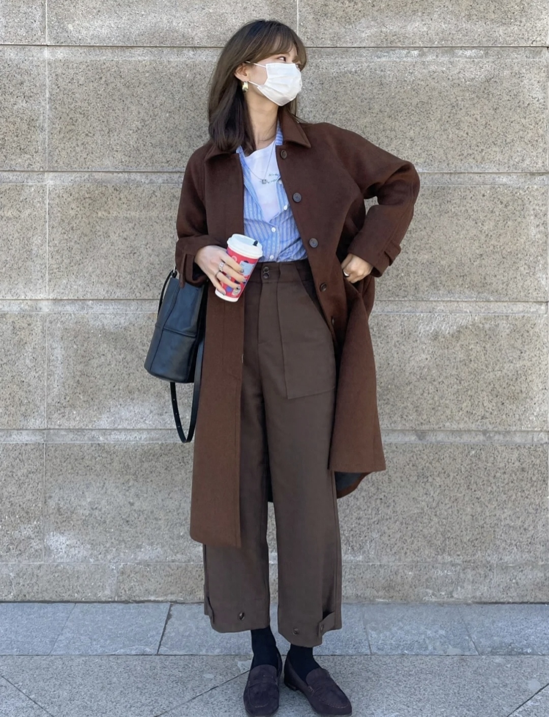look9 焦糖色大衣+条纹衬衫/同色系阔腿裤