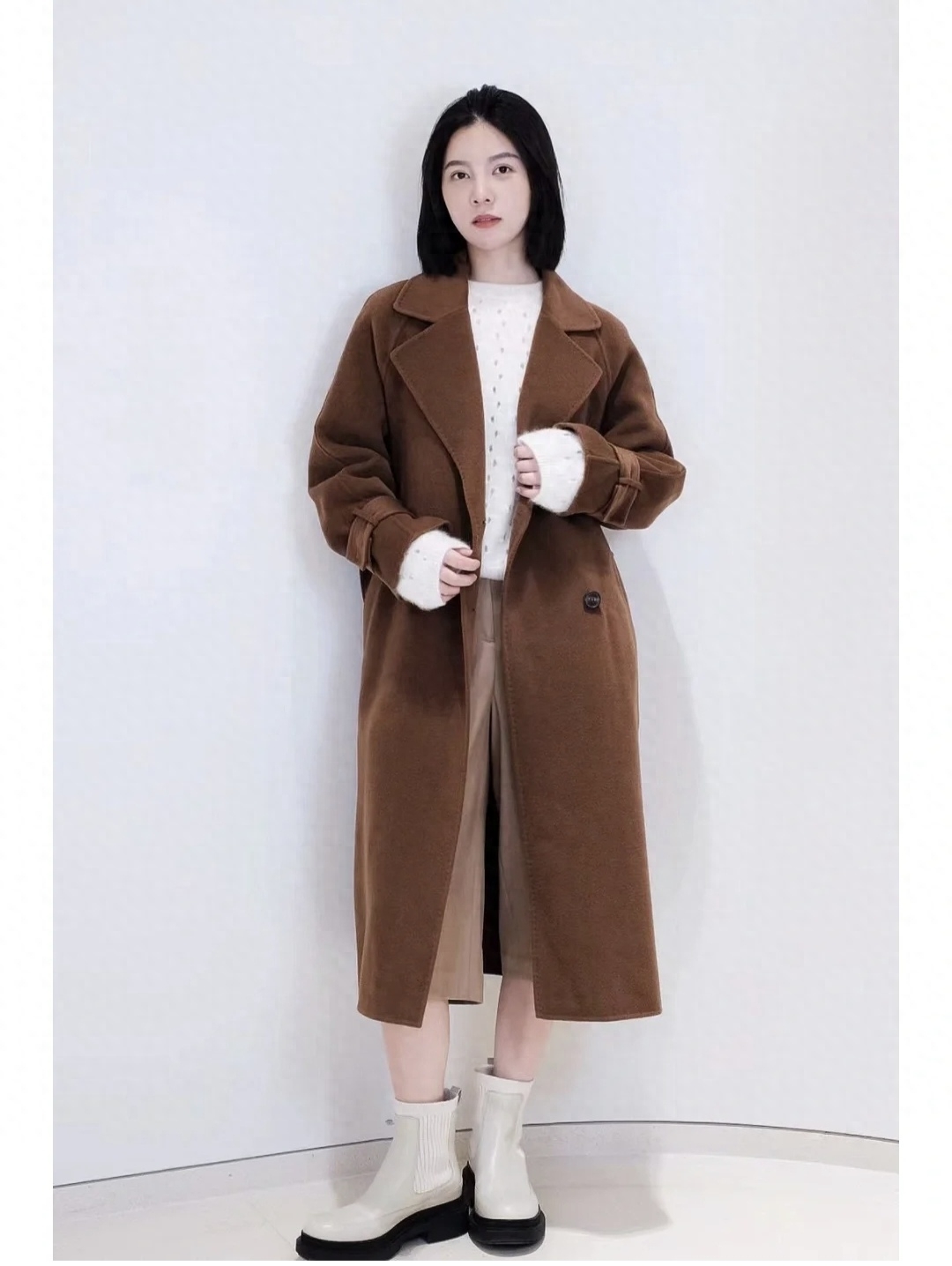 look7 焦糖大衣+白色毛衣/白色牛仔裤/黑色短靴