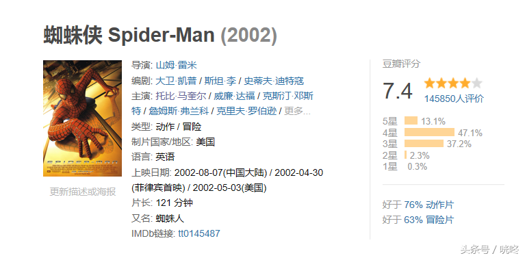 好吧,下面让我们把实现从东亚岛国转移到大西洋彼岸,时间快退到2002年5月3号,一部由托比•马奎尔饰演的真正意义上的蜘蛛侠大电影于各影院上映,截至目前为止该电影豆瓣评分7.4分,共有十几万人参与评价,打三星、四星者占据总人数的84.3%,好于 76% 动作片和63% 冒险片。该部蜘蛛侠扮演者托比•马奎尔饰演一位笨拙、木讷的高中生,后参观实验室时被蜘蛛咬伤而获得超能力。该部蜘蛛侠缺少原作漫画中的灵气,把一名嘴炮少年描述成抑郁但充满执着的笨小孩,但奔着先入为主的观念该系列在影迷心中留下了不可替代的地位。