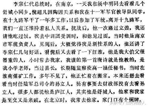 李宗仁在南京时,一天我和杨中明同去看看几个舒城小同乡。倪超凡因陶因关系和我在十一军军官教导队同学,在十九路军干了一年多工作,以后参加了军统,离开十九路军,我们一直还维持着私人关系。抗战后,他一次路过立煌(时安徽省会),我还请他吃过饭。我去中训团受调时,和他见过面。当时他是南京市军统负责人,见到后,大概觉得我是新桂系的人,他还讲了李宗仁几句好话。看倪后又去看了一下汪淮,他是我大伯父很器重的人,小时常去我家吗,我读的第一首唐诗就是他教的,是我小学老师,当过县长,长期随监察使高一涵任秘书,当时在淮南煤矿工作。多年不见了,他正忙着在搬家。本来还想去看看当孙立人。杨有事要去财政部没有去看孙立人。很多人都说他是庐江人,其实他是舒城人,他家和我家是至交义是亲戚。在北京时,我常去他家。家门口有个铜牌……