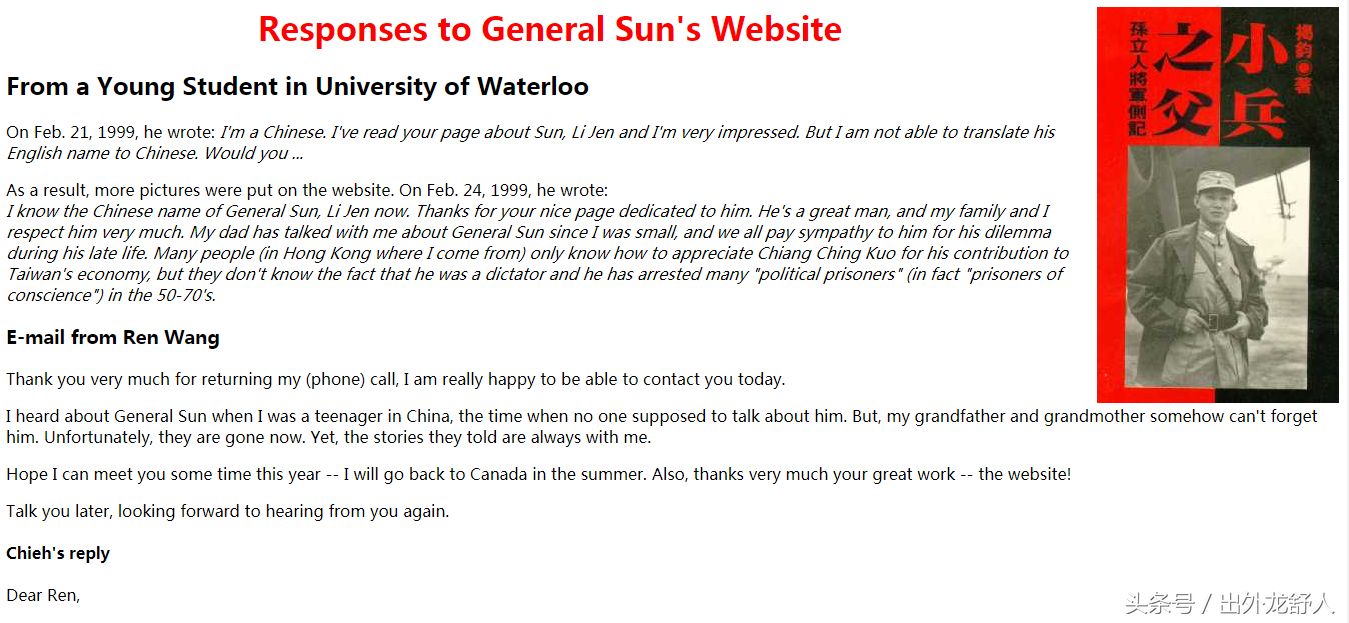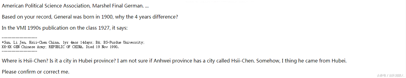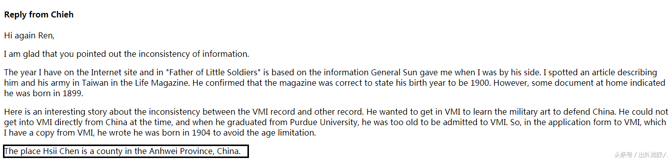 在网站留言板上,有一名网友曾留言质疑孙将军籍贯“Hsii-Chen”是否湖北省某座城市。