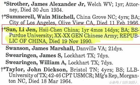 孙立人,中国舒城;文学学士; 普渡大学理学学士;中国陆军上将,死于1990年11月19日。