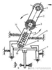 1-滚轮 2-上转臂 3、5、11-弹簧 4-套架 6-滑轮 7-压板 8、9-触点 10-横板