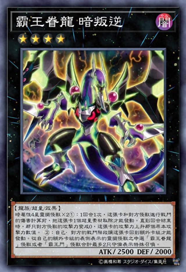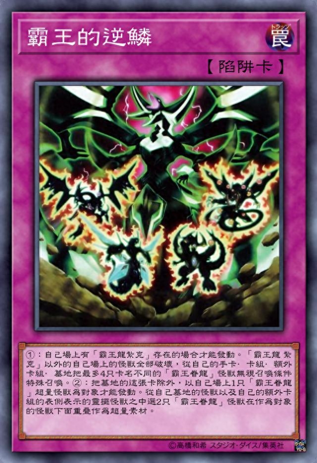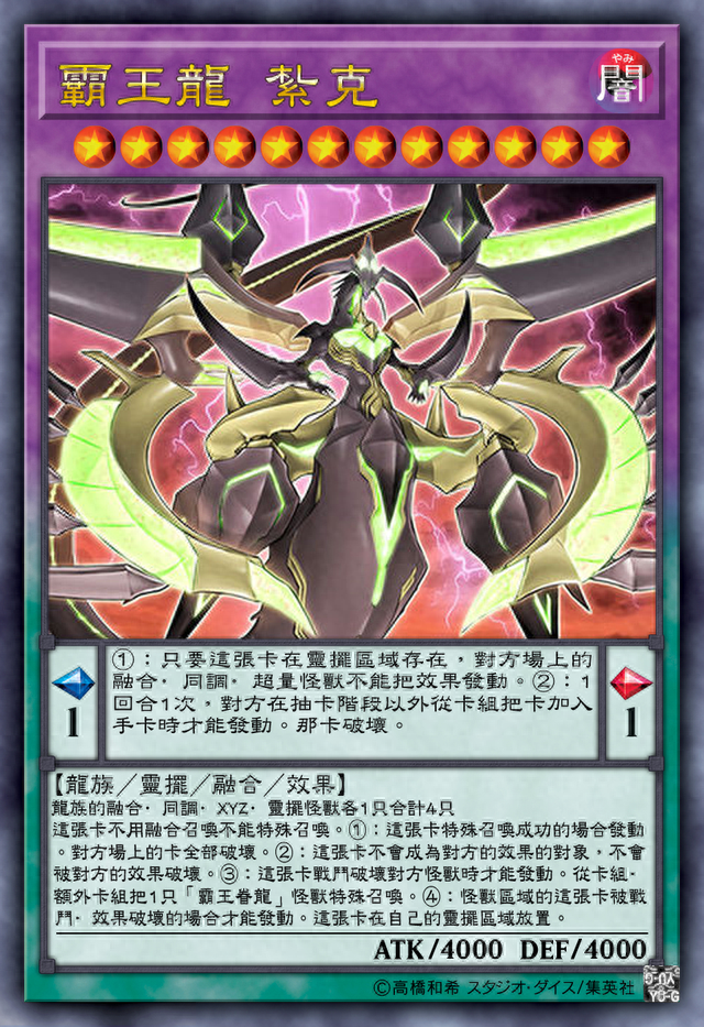 各位小伙伴,大家好,这里是社长!对于游戏王初代以及第二部社长看得比较多,到了超量、同调甚至link的时代,社长对于动画就差不多接近脱轨了,但是卡牌还是了解一些。在动画《游戏王ARC-V》中,“霸王龙 扎克”是恶魔决斗者扎克(Z-ARC)所操纵的毁灭世界的凶恶之龙,由异色眼灵摆龙、暗叛逆XYZ龙、幻透翼同调龙和凶饿毒融合龙合体而来(一开始用的是异色眼龙)。今天社长和各位小伙伴就来聊聊扎克的霸王卡组。