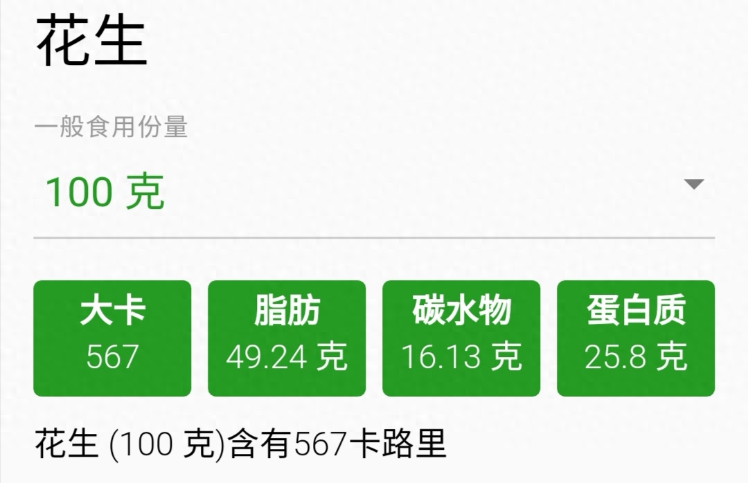 减肥中的饮食控制一定要有大局观,不能只揪着某一样食品的热量来看。花生热量爆炸,吃两粒,也不见得会一秒发胖。只要简单计算一下每日摄入的热量总量,从整体上进行控制。