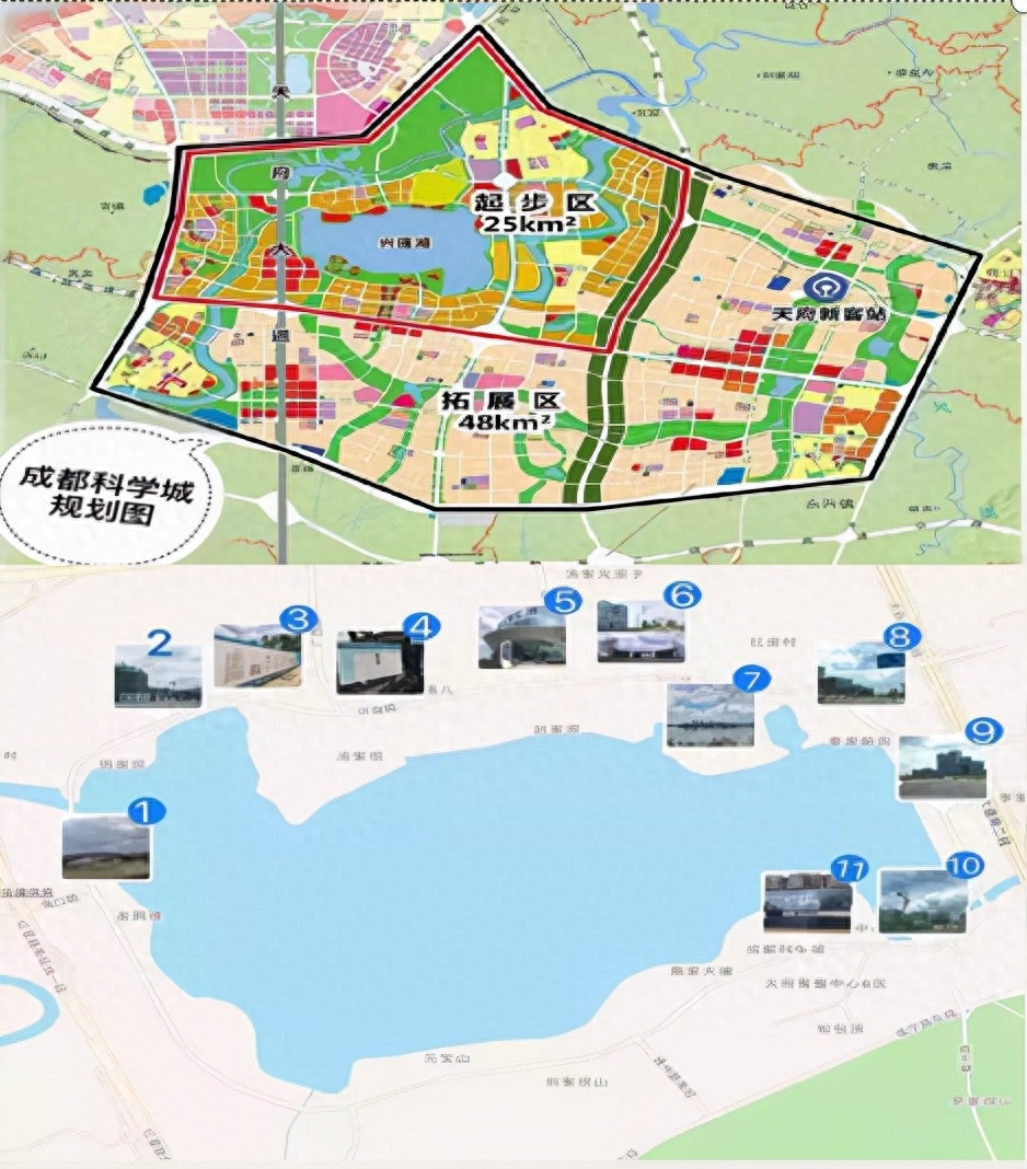 成都科学城规划面积73平方公里,起步区25平方公里,环兴隆湖布局建设科学研究及应用转化、信息网络、生物医药、创意设计、军民融合、中德合作等六大产业组团,重点发展基础科研、互联网大数据、生物科技、高端制造、现代金融、创意设计、研发服务等高端产业。