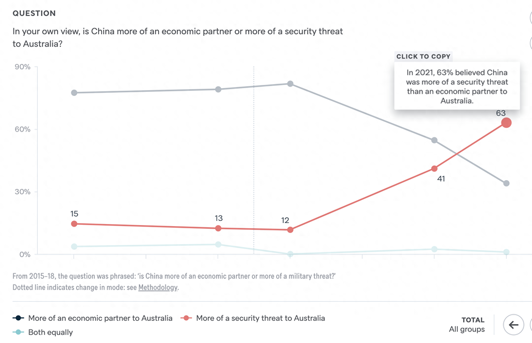 去年,澳大利亚智库洛伊研究所发布民调显示,63%的澳大利亚人将中国视为安全威胁而非经济伙伴,这是一个“显著转变”——2020年,只有41%的人有这种感觉;而在2018年,82%的受访者视中国为经济伙伴,而不是安全威胁。