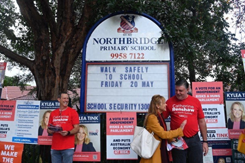 在北悉尼选区(North Sydney)的Willoughby公校投票站,该区议员、自由党的特伦特·齐默曼(Trent Zimmerman)携家人一同投票。在这一选区,他需要对阵工党候选人凯瑟琳·伦肖(Catherine Renshaw)和独立候选人丁凯丽(Kylea Tink)。